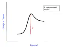 There are three main shapes for voltammograms. The first shape is dependent on the diffusion layer.[1] If the analyte is continuously stirred, the diffusion later will be a constant width and produce a voltammogram that reaches a constant current. The graph takes this shape as the current increases from the background residual to reach the limiting current (il). If the mixture is not stirred, the width of the diffusion layer eventually increases. This can be observed by the maximum peak current (ip), and is identified by the highest point on the graph. The third common shape for a voltammogram measures the sample for change in current rather than current applied. A maximum current is still observed, but represents the maximum change in current (ip).[10]