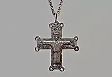The sculpture bears no stylistic relationship to Lombard sculpture of the tenth or eleventh century, however. The iconography of a completely robed crucified Christ wearing a colobium—an ankle-length tunic—is more familiar in the East than in the West, although a near life-size Crucifixion, carved in the round, is contrary to Byzantine norms.[7] Life-size crucified Christs were more common in Germany from the late eleventh century, following the Gero Cross of Cologne Cathedral of about 970, which seems to have been the prototype. The long robe may be a Byzantine influence, although many Western examples also exist, in Ottonian illuminated manuscripts and other media. The belt of the Holy Face is unprecedented in a Crucifixion from either East or West.[8]