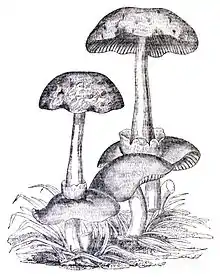Seven years later, Miles Berkeley described the fungus as Agaricus loveianus, not aware of Knapp's previous publication, and wrote that it was "a most elegant and curious species which ... appears not to have been hitherto noticed."[4] Berkeley's name was frequently used in literature to refer to the fungus for over a century rather than Knapp.[5] In his 1917 North American Flora, William Alphonso Murrill proposed a new name combination for the species based on Berkeley's name, Volvariopsis loweiana.[6] In 1942, John Ramsbottom discovered Knapp's image and description of the fungus, and realizing it referred to the same species as Berkeley's Agaricus loveianus, made the new combination Volvaria surrecta.[7] Rolf Singer transferred it to the genus Volvariella in 1951, giving it the name by which it is known presently.[8]