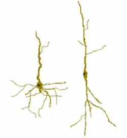 ![]() Cartoon of a normal pyramidal cell (left) compared with a von Economo cell (right) | |