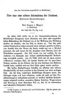 - Von Hippel E (1904). "Ueber eine sehr seltene Erkrankung der Netzhaut". Albrecht von Graefes Arch Ophthal. 59: 83–106. doi:10.1007/bf01994821. S2CID 22425158.