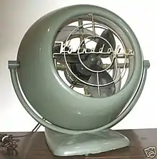 Early fans were designed by industrial designer Richard Ten Eyck,[7] and were distinguished from ordinary fans by enclosure in a short duct shaped as aerodynamically contoured cylindrical ring, with an added concentric flared intake duct ring, sharply pitched blades, stationary vanes and aerodynamic grille, and rubber shock-mounting. The design was advertised as making the fan exceptionally quiet, efficient and effective, delivering a narrower, more-concentrated blast of air than normal fans.[5][8]