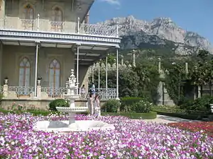 The palace sits surrounded by gardens and a park; these grounds consisting of 40 hectares (99 acres)[10] were laid out by the German landscape gardener Carolus Keebach[11] in the first half of the 19th century in the form of an amphitheatre featuring wide open spaces and gardens planted alongside the walkways.[6] The walkways are gravelled with 29 bags of coloured stones from the Crimean village of Koktebel.[6]