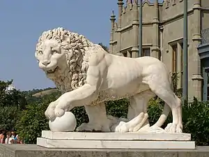 In the summer of 1848, the palace and its grounds were enhanced by the addition of three pairs of white marble lions; this statuary was placed alongside the wide flight of steps climbing the terraces to the palace.[25] Each of the statues, by Italian sculptor Giovanni Bonnani, is depicted in a varying pose – a pair of "sleeping lions" at the bottom of the steps, "waking lions" near the centre, and "standing Medici lions" at the top nearest the palace.[37]