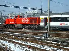 An order with the Swiss Federal Railways for 59 diesel locomotives to replace the Bm 6/6 and Em 6/6 types for heavy shunting in freight yards, and trip and construction work resulted in the SBB Am843. The locomotives use a Caterpillar Inc. 3512B DI-TA SCAC engine rated at 1,500 kW (2,000 hp) and Voith L5R4zseU2 two speed hydraulic transmission giving a 40 km/h (25 mph) top speed in the lower gear.[9] The locomotives also have a particulate filter engineered by Hug Engineering of Switzerland which reduces NOx and particulate emissions to low levels.[10][11]
