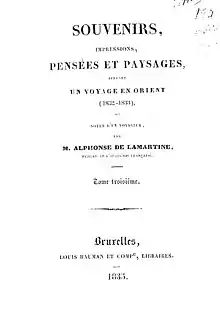 Impressions, souvenirs, pensées et paysages pendant un voyage en Orient, 1832-1833, ou Notes d'un voyageur, shortened to Voyage en Orient, is a travel journal written by Alphonse de Lamartine. This book narrates Lamartine’s journey to several Middle Eastern regions now known as Turkey, Lebanon, Israel, and Syria but also South Eastern European countries such as Cyprus, Greece, and Serbia.[1] The book was published in 1835, and is divided in four volumes, comprising a total of 1260 pages.