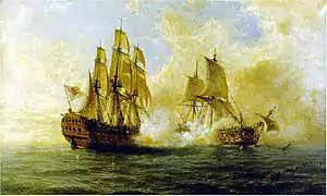 The Glorioso engaged by the Russell in her last battle. The wreck of the sinking Dartmouth is seen on the background.