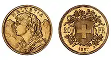 Vreneli (aka Goldvreneli[1]) is the informal name for a range of legal tender gold coins of the Swiss franc. The coins were issued between 1897 and 1936, in 1947 and in 1949. All coins issued after 1936 are restrikes (legal tender ceased September 29, 1936).[2]