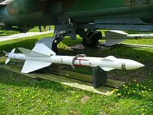 The missile, designated R-23, entered service in January 1974, the SARH version as the R-23R, the IR version R-23T. The R-23R, weighing 222 kg (489 lb), used a monopulse radar which gave it better ECM resistance compared to the AIM-7E-2. The R-23T was lighter at 215 kg (474 lb) and used a liquid nitrogen-cooled infrared seeker which required it be locked on to the target before launching, either by the launching aircraft's radar or IRST. Both versions used the same radar fused warhead, which had a lethal radius of 8 m (26 ft) and could bring down bomber-sized targets.[1] In the West these were known as the AA-7A and AA-7B, respectively. An inert training round, the R-23UT, was also developed.