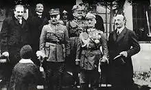 Upon the outbreak of the First World War in July 1914, Sikorski was mobilized, but through KSSN influence he was allowed to participate in the organizing of the Polish military units, rather than being delegated to other duties by the Austro-Hungarian military command.[3] In the first few weeks of the war he became the chief of the Military Department in the Supreme National Committee (Naczelny Komitet Narodowy, NKN) and remained in this post until 1916.[3] He was a commissioner in charge of the recruitment to the Polish Legions in Kraków, choosing this role over the opportunity to serve in the Legions as a frontline commander.[3][6] On 30 September 1914 he was promoted to podpułkownik (lieutenant colonel), and soon after that he became the commander of a Legions officer school (Szkoła Podchorążych).[3][4] The Legions—the army created by Józef Piłsudski to liberate Poland from Russian and, ultimately, Austro-Hungarian and German rule—initially fought in alliance with Austria-Hungary against Russia. From August 1915 there was growing tension between Sikorski, who advocated cooperation with Austria-Hungary, and Piłsudski, who felt that Austria-Hungary and Germany had betrayed the trust of the Polish people.[3][6] In 1916 Piłsudski actively campaigned to have the Military Department of NKN disbanded.[6] In July that year, Sikorski was promoted to pułkownik (colonel).[4] Following the Act of 5th November (1916), Sikorski became involved with the Legions' alternatives, the Polish Auxiliary Corps and Polnische Wehrmacht.[6] In June 1917 Piłsudski refused Austro-Hungarian orders to swear loyalty to the Habsburg Emperor (the "oath crisis") and was interned at the fortress of Magdeburg, while Sikorski abandoned Polnische Wehrmacht and returned to the Austro-Hungarian Army.[6] In 1918, however, following the February Treaty of Brest-Litovsk and the battle of Rarańcza, Sikorski chose belatedly to side with Piłsudski, announcing solidarity with his actions, protesting against the planned separation of Chełm Land from the planned Polish state, and thus soon joined Piłsudski in internment (he would be held in Dulfalva (Dulovo)).[4][6] Nonetheless, this was not enough to smooth the differences between him and Piłsudski, and these two major Polish leaders would drift farther apart in the continuing years.[4]