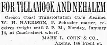 The coast route also included service to Portland, Oregon, either by connecting river steamer or Harrison itself. As of January 1895, under Captain P. Schrader, Harrison was running for the Oregon Coast Transportation Company, and scheduled to depart from Portland to Tillamook and Nehalem, receiving freight at Portland's Couch Street wharf on the Willamette River until 5 p.m. on Monday, January 14, 1895.[13] Mark L. Cohn & Co., of 146 Front Street, were the agents for Harrison.[13] On Wednesday, May 10, 1899, weather permitting, Harrison was scheduled to sail for Tillamook, Garibaldi, Bay City, and Hobsonville, running in conjunction with the Columbia river sternwheeler R.R. Thompson, which at that time was employed in carrying passenger and cargo to Astoria from points on the lower Columbia River.[14][15]