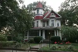 The W. L. Wood House is a historic house at 709 North Morrill Street in Morrilton, Arkansas. It is a 2+1⁄2-story wood-frame structure, with a hip roof, weatherboard exterior, and foundation of stone and brick. It has the asymmetrical massing typical of the Queen Anne period, with a three-story turret at the left corner, and a porch that wraps across the front and around the base of the tower. The porch is supported by round columns and has a turned balustrade and a low gable over the main steps. A large gable that projects from the main roof has a rounded-corner balcony at its center. The interior has richly detailed woodwork in the Eastlake style. The house was purchased as a prefab from Sears & Roebuck, shipped by rail to Morrilton, moved to its current location by mule drawn wagon and built in 1905–06 for William L. Wood, a prominent local businessman.[2]