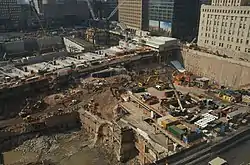 Eventually, it was decided that the Cortlandt Street station was to be rebuilt as part of the greater World Trade Center reconstruction project; since the station was such a vital one in the area, a permanent closure was infeasible.[36] As part of the project, the East Bathtub was extended under the line to the eastern boundary of the site at Church Street. George Pataki, who was the governor of New York at the time, stated, "This is going to help more than a million people by restoring service, help the recovery of lower Manhattan and sends a powerful message that New York City can't be stopped."[37] The Port Authority's chief engineer and others tried to convince him to temporarily shut down the line while the new transportation hub at the World Trade Center was under construction. The Governor's decision to keep the line open increased the cost of the project because the subway structure had to be underpinned.[38] The new tunnel measured 100 feet (30 m) wide to accommodate the future reconstruction of the Cortlandt Street station;[35] it was otherwise designed to the same specifications as the original tunnel, with columns placed every 5 feet.[33] The line reopened on September 15, 2002, with trains bypassing the site of the Cortlandt Street station.[39][40]