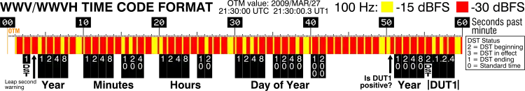 - The audio tones sent during the first 45 seconds of most minutes are swapped: 600 Hz is played during even minutes, and 500 Hz is played during odd minutes. (Receiving both simultaneously gives the listener a sound similar to a continuously-ringing chime.)
