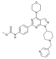 • COC(=O)NC1=CC=C(C=C1)C2=NC3=C(C=NN3C4CCN(CC4)CC5=CN=CC=C5)C(=N2)N6CCOCC6