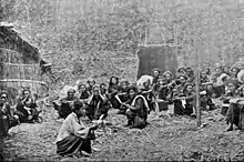 In the traditional Wa society monogamous marriage was the norm and there was sexual freedom for both men and women before marriage. The chewing of betel with areca nut was formerly also an important custom.[8] The Wa have different kinds of traditional dances. One important dance in their culture is accompanied by the beating of a large hollow wooden drum. This way of dancing, among other Wa dances[9] such as the hair dance[10] and festivals,[11] is being promoted as a tourist attraction by the Yunnan tourism authorities in China.[12]