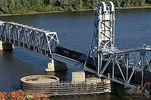 Built as a swing span, the bridge was converted in 1994 to a vertical lift bridge to increase the width of the navigational channel. The vertical lift span was taken from a bridge over the Tennessee River at Florence, Alabama. To minimize the effect on river traffic, the new span was installed over the course of three days.