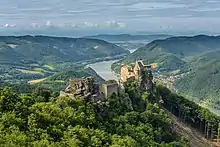 Burgruine Aggstein is the remnant of a castle on the right bank of the Danube, north of Melk. It is 15 kilometres (9.3 mi) from Melk. According to archaeological excavations of the foundations of the castle it has been inferred that the castle was built in the early part of the 12th century. The old name of the castle was Dunkelsteinerwald. The castle was built by the Kuenringer family (famed for their notoriety) by Manegold III Aggsbach Getbeen of the Kuenringer family descent and his son Aggstein Manegold IV inherited it as a fiefdom of Bavaria. They started living in the castle from 1180 CE onwards. Its notoriety was due to the "robber barons" of Schloss Schonbuhel and Burg Agstein" who imprisoned their rivals for ransom and tied them to a rock ledge all the time threatening to kill them by throwing them into the gorge.[7] The castle was built about 300 feet (91 m) above the river bank on a 150 feet (46 m) rock ledge, by Manegold III of Acchispach. In 1181, it came into the possession of the Kuenringer Aggsbach-Gansbach. The castle was besieged during the revolt of the Austrian nobility against Duke Albrecht I in 1295/96. Kuenringer Leutold occupied the castle from 1348 to 1355 and then it fell into disrepair.[36][37]