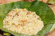 Wachipa (Nepali वाचिपा)is a typical Kirat Rai People dish made with rice, minced chicken, and powder made out of burnt feathers of a chicken. The powder gives a unique bitter taste. Vegetarian wachipa is made by replacing meat with leaves or flowers of a plant called Damlapa, which is also bitter. It is eaten on special occasions. It is believed that consumption of wachipa cures body aches.[1] It is called Wamik in Lohorung.