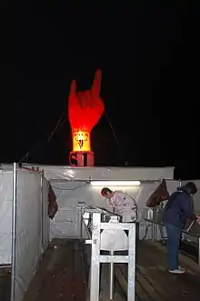 In subsequent years, too, most of the tasks were carried out by the small team. Until August 1994, for example, ticket orders were organised privately by Andy Göser's mother Regina Göser and security duties were performed by friendly motorcycle clubs up until 1996.[5] In 1991, the number of visitors increased to 1,300,[5] and with Skyline returning, Bon Scott, an AC/DC cover band from Hamburg, Gypsy Kyss, Kilgore, Life Artist, Ruby Red, and Shanghai'd Guts joined them on stage for an all-regional roster.[6] That same year, the iconic skull logo was designed by Mark Ramsauer after the basic shape had been determined by Thomas Jensen and Holger Hübner.[7] The cow skull refers to the venue, a meadow for cows, and to Jensen and Hübner as "boys from the village".[8]