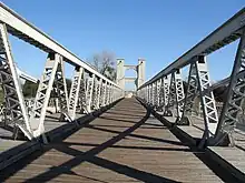 Beginning in October 2020, the bridge was closed as part of a $12.4 million rehabilitation project that involved replacing the suspension cables that had been installed in 1914, reinforcing the anchors, and replacing the decking. Temporary piers were placed in the river to support the deck while the cables were removed.[8][9]