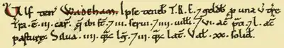 - Ulf ten(et) WADEHAM. Ipse teneb(at) T(empore) E(dwardi) R(egis). Geld(a)b(at) p(ro) una v(irgata) t(er)rae. T(er)ra e(st) III car(rucis) q(uae) ibi s(un)t. III servi, IIII vill(an)i, VI ac(rae) pti L ac(rae) pasturae, silva IIII l(on)g(a) III lat(a). Valet XX solidii ("Ulf holds Wadham. He himself held it in the time of King Edward (the Confessor). It paid tax for 1 virgate of land. Land for 3 ploughs which are there. 3 slaves, 4 villagers, 6 acres of ..., 50 acres of pasture, wood 4 furlongs long, 3 furlongs wide. It is worth 20 shillings).