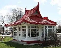 Early gas stations were small, ugly or utilitarian buildings that attracted little notice and even complaints from neighbors. Dodge hired Milwaukee architect Alexander C. Eschweiler to design eye-catching stations.[2] Inspired by Japanese culture, which was popular at the turn of the century, he created Wadham's signature pagoda.[2] As well as a prime example of Japonism, the design was one of the earlier examples of architecture forging a brand identity.