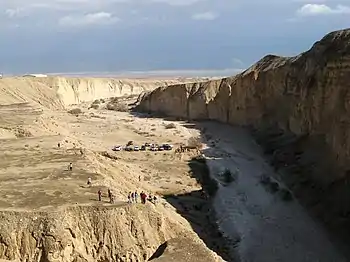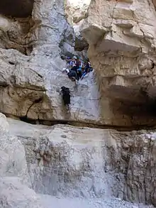 On the course of the wadi are the ruins of the Monastery of Theoctistus, known in Arabic as Deir Muqallik.[7] They are hard to access, being situated quite high on the steep northern bank of the wadi at the spot where the valley deepens, turning into a canyon.[7] According to Byzantine sources, it was established in the 5th century by Euthymius and Theoctistus.[7] Archaeologists confirm that the main phase of the cave church complex and related structures date back to the 5th-7th century, the monastery's 'golden era', with signs of a far less significant habitation period during the Early-Mid Muslim period in the 7th-11th or 12th century.[7] The cave church complex was established at the beginning of the 5th century, and at the end of the 8th the monastery was deserted.[7]