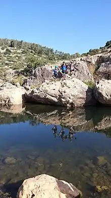 The West Bank part of Wadi Qana, surrounded by Palestinian villages such as Deir Istiya, Qarawat Bani Hassan, Biddya, Sanniriya, Kafr Thulth, Azzun, Kafr Laqif and Jinsafut,[26] runs through a fertile valley and constituted one of the most notable natural attractions in terms of the beauty of its landscape, given its abundance of springs, extent of its well-watered land, and plentiful trees.[26] The area has traditionally furnished local Palestinians with important land for grazing livestock, harvesting agricultural products, especially citrus, and for leisure (bathing).[lower-alpha 8] Many families also used it to dwell along the wadi's reaches. Its water was drawn in order to irrigate vegetable plots.[4] It afforded rich grazing for flocks, carrying an estimated 50,000 sheep down to the early 1980s, compared to the 3,000 Palestinians still manage to tend in the wadi in recent years (2017).[27] The wadi runs between the Palestinian administrative zones of the Salfit and Qalqilya Governorates.[4]