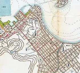 The waegwan of Dumo-po (Korean: 두모포; Hanja: 豆毛浦) is located in Jwacheon-dong, Busan. Established in 1607, 500 Japanese from Tsushima inaugurated the opening of the new settlement. It was also called the kowakan (Japanese: 古倭館, lit: 'old wakan') as the location of the waegwan was moved in 1678, over complaints that Jwacheon was too narrow and had a lack of dock facilities.[9] Tsushima-Fuchū oversaw the construction of facilities like Tōko-ji (东向寺) temple, guest quarters, izakayas, and more, centered around a banquet hall, the yeonhyangdaecheong (Hanja: 宴享大廳).[9]
