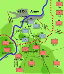 After the Dutch surrender, the Leibstandarte moved south to France on 24 May. Becoming part of the XIX Panzer Corps under the command of General Heinz Guderian, they took up a position 15 miles south west of Dunkirk along the line of the Aa Canal, facing the Allied defensive line near Watten.[53] A patrol from the SS-VT Division crossed the canal at Saint-Venant, but was destroyed by British armour. A larger force from the SS-VT Division then crossed the canal and formed a bridgehead at Saint-Venant; 30 miles from Dunkirk.[53] That night the OKW ordered the advance to halt, with the British Expeditionary Force trapped. The Leibstandarte paused for the night. However, on the following day, in defiance of Hitler's orders, Dietrich ordered his 3rd Battalion to cross the canal and take the heights beyond, where British artillery observers were putting the regiment at risk. They assaulted the heights and drove the observers off. Instead of being censured for his act of defiance, Dietrich was awarded the Knight's Cross of the Iron Cross.[55] On that same day, British forces attacked Saint-Venant, forcing the SS-VT Division to retreat.[53]