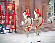 The lowering of the flags ceremony at the Attari–Wagah border is a daily Central Armed Police Force's (CAPF) practice that the security forces of India (Border Security Force) and Pakistan (Pakistan Rangers) have jointly followed since 1959.[2] The drill is characterized by elaborate and rapid dance-like manoeuvres and raising legs as high as possible, which have been described as "colourful".[2] It is both a symbol of the two countries’ rivalry, and a display of brotherhood and cooperation between the two nations.