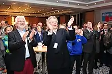 After months of factional infighting and a cancelled party gathering in June 2015, Frauke Petry was elected on 4 July 2015 as the de facto principal speaker of the party with 60% of the member votes ahead of Bernd Lucke at a party congress in Essen.[77] Petry was a member of the national-conservative faction of AfD.[78] Her leadership was widely seen as heralding a shift of the party to the right to focus more on issues such as migration, Islam, and strengthening ties to Russia, a shift which was claimed by Lucke as turning the party into a "Pegida party".[79] In the following week, five MEPs exited the party on 7 July, the only remaining MEPs being Beatrix von Storch and Marcus Pretzell,[80] and Lucke announced on 8 July 2015 that he was resigning from AfD, citing the rise of xenophobic and pro-Russian sentiments in the party.[81] At a meeting of members of the Wake-up call (Weckruf 2015) group on 19 July 2015, AfD founder Bernd Lucke and former AfD members announced they would form a new party, the Alliance for Progress and Renewal, under the founding principles of AfD.[82]