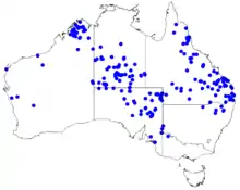 The species is found on the edges of swamps and creek beds and damp flats in the Kimberley region of Western Australia where it grows in sandy-loam soils.[3] In the Territory it is found on mulga-dominated plains, alluvial plains and intermittent watercourses.[5]
