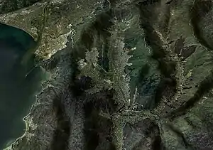 Wainuiomata occupies a basin at the headwaters of the Wainuiomata River, between the eastern Hutt hills and the Orongorongo Range. There are conflicting reports about the evidence of Māori occupation of the basin prior to European settlement. One source says there is evidence Māori were in Wainuiomata from the moa-hunting period and the iwi Rangitane, Ngāti Ira and Kahungunu were all settled there.[6][7] The earliest European settlements grew up around the river, where timber mills supplied the Wellington region when the demand was great in the 1850s and '60s. Today this area is known as "The Village" or "Homedale". The isolated location of Wainuiomata proved a problem for early settlers. Narrow hill-routes into the settlement were the only access during the 1850s and 1860s. By the end of the 19th century there were two roads in the valley: Main Road and Fitzherbert Road (known locally as "Swamp Road").[8]