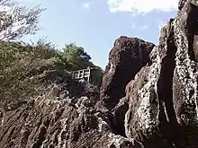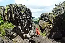 Many of the boulders have deep solution basins and fluting formed on their surfaces as they very slowly slid down the valley sides - a particularly good example of the relatively rare phenomenon of karst formation on basalt (sometimes known as proto-karst).[6] This phenomenon was documented by geologists as early as the 1920s-1940s in Hawaii[7][8] and New Zealand.[9] Usually karst landforms are formed by solution of calcareous rocks (e.g. limestone and marble) by mildly acidic percolating water. At Wairere, and elsewhere, basalt has been dissolved, probably over a much longer interval of time, by the production of weakly acidic humic acid in the leaf litter that collects around the roots of plants that grow on the top of the boulders, usually beneath a forest canopy.[10] On the top of the boulders this humic acid has etched out solution basins 20–50 cm across and of similar depth. Humic acid seeping down the sides of the boulders has, over thousands of years, dissolved deep, near-vertical flutes out of the hard basalt. In some places the fluting is no longer vertical as the boulders have rolled over or tilted since it was formed.
