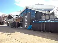 An ichiba is a market, of which there are two in Marina City. The larger is a "fisherman's wharf"-style fish market, which sells both fresh-caught fish and cooked fish dishes. There are small fire pits available both inside and outside to allow guests to cook their purchases on site. Aside from the food, the principal attraction is a whole tuna filleting show. The building itself features 6,767.08 square meters of floor space on four levels.[26] The smaller market is an outdoor farmers market, featuring fruit and vegetables from the local farmers.[27][28]