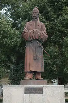 Wake no Kiyomaro (和気 清麻呂, 733–799) was a high-ranking Japanese official during the Nara period. He was born in Bizen Province (now Wake, Okayama) to a family of politically important, devoted Buddhists who hoped to keep Buddhism and politics separate through religious reform. He became a trusted advisor to Emperor Kanmu, a position which he used to encourage the development of Buddhism in a direction which would prevent it from posing a threat to the government.[1][2] According to the Shoku Nihongi, he was sent to the Usa Shrine to receive a divine message; stating that only those of descent from Amaterasu could become emperor, it refuted the previous divine message claiming Dōkyō was to be the next emperor after Empress Kōken (later Empress Shōtoku).[3] This report angered Dōkyō, who used his influence with the Empress to have an edict issued sending Kiyomaro into exile; he also had the sinews of Kiyomaro's legs cut, and only the protection of the Fujiwara clan saved him from being killed outright.[4]