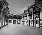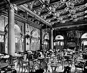 The Empire Room was the largest and most lavishly adorned room in the Waldorf, and soon after opening it became one of the best restaurants in New York City, rivaling Delmonico's and Sherry's.[70] It was modelled after the grand salon in King Ludwig's palace at Munich, with satin hangings, upholstery and marble pillars, all of pale green, and Crowninshield's frescoes.[71] Empire in style, the Waldorf's restaurant featured feathered columns of dark-green marble, and the pilasters that were opposite were of mahogany, with ormolu work in the panels.[34] The caps and bases of both columns and pilasters were gilded. This treatment occupied most of the wall space. The ceiling was divided by heavy beams running from column to column, and between these the flat space was divided into oval and other shaped panels with light mouldings.[34] The color scheme was in tints of pale-green and cream. The panels of the ceiling were frescoed with figures in pinkish-red on a blue sky or field. The walls were principally mahogany and gold, with a little color in the comparatively small wall-spaces left between openings.[72] Among the other rooms were the Turkish smoking room, with low divans and ancient Moorish armor, and the ballroom, in white and gold, with Louis XIV decorations.[64]