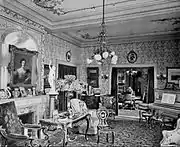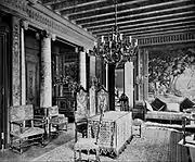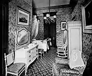The Waldorf State Apartments, consisting of nine suites, were located on the second floor. The apartments, including the Henry IV Drawing Room, featured 16th and 17th century French and Italian antiques which Boldt and his wife had brought back from Europe.[72] Francois V Bedroom was a reproduction of the room at the Palais de Fontainebleau, and over the years was occupied by the likes of Li Hung-Chang of China, Chowfa Maha Rajiravuth, Prince of Siam, and Albert of Saxe-Coburg.[73] The apartments had their own music room and a banquet hall to seat 20, with a handsome china collection including 48 Sevres plates with European portraits.[74] There were about 6,000 lights in the hotel, with as many as 1,000 small candelabra lamps mounted in specially designed fixtures.[75] The electric fixtures were all furnished by the Archer & Pancoast Manufacturing Company, of New York, while the contract for the general installation work was carried out by the Edison Electric Illuminating Company, of New York, the actual work of wiring being done by the Eastern District of the General Electric Company. The building was wired throughout on the system of the Interior Conduit and Insulation Company.[75]