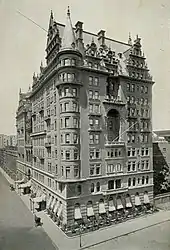 The Astoria Hotel, opened in 1897, was situated on the southwest corner of Fifth Avenue and 34th Street. Like the Waldorf, it was designed in the German Renaissance style by Henry J. Hardenbergh, the same architect who designed the Waldorf.[26][67] With dimensions of 99 by 350 feet (30 m × 107 m), its height, from the floor of the sub-basement, which was 33 feet (10 m) below the street level, to the roof-line, was about 270 feet (82 m), or about 240 feet (73 m) above the street-level. It was 16 stories in height, including the four stories in the roof.[34] The building was constructed of stone, marble and brick, with a steel skeleton frame and modern fireproof interior construction, and was embellished with "French Second Empire Mansard-roofed towers with iron-work cresting as well as Austrian Baroque onion-domes over corners turrets".[60][67] There were 25 public rooms and 550 guest rooms, with miles of corridors, vestibules and balls.[67] The entrance featured a double set of plate glass doors to give protection in cold weather, and a U-shaped driveway for horse and carriages.[76]