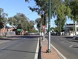 ![]() Main street, Walgett (Fox Street/Castlereagh Highway) looking south over Wee Waa Street | |||||||||