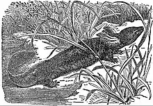 Different accounts offer wide-ranging descriptions of the creature.[2][3] One of the earliest and most famous accounts by a local man named J.A. Johnson described an animal that was dull grey or brown and similar to an alligator, but much larger and heavier with a horn between its eyes and nostrils.[2][3] Johnson and two others claimed to see the monster from twenty yards away and the men estimated the creature to be about forty feet long.[2][3] Other reported sightings claim that the creature was similar to a very large catfish or mudpuppy.[2] The Nebraska State Historical Society reports that contemporary accounts believed Johnson actually saw an unusually large beaver.[2]