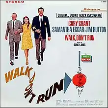 Walk, Don't Run is the soundtrack to the 1966 film of the same name composed by Quincy Jones. It was orchestrated by Jack Hayes and Leo Shuken.[2] Allmusic's Stephen Cook describes the score as having a "Henry Mancini inspired sound", with "excellent contributions from Toots Thielemans and Harry "Sweets" Edison".[3] Jones collaborated with Peggy Lee on the songs "Happy Feet" and "Stay with Me".[4] Jones was recommended to score the film for Cary Grant, who had met him through Lee.[5]