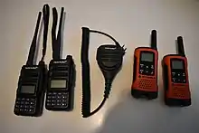 A walkie-talkie, more formally known as a handheld transceiver (HT), is a hand-held, portable, two-way radio transceiver. Its development during the Second World War has been variously credited to Donald Hings, radio engineer Alfred J. Gross, Henryk Magnuski and engineering teams at Motorola. First used for infantry, similar designs were created for field artillery and tank units, and after the war, walkie-talkies spread to public safety and eventually commercial and jobsite work.[1]