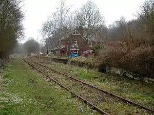 Passenger services over the line were withdrawn in 1956 and the station closed to passenger traffic.[4] The line through the closed station was singled in 1971 but the platform and some of the station buildings remain in existence. The line through the station continued in use until 1988 for freight services and since 1988 the line has officially been out of use but not closed.