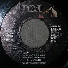 "Wall of Tears" was released as a single via RCA Victor Records in December 1986. It would be her first RCA release.[7] It was distributed as a seven inch single, with the B-side being "Two Hearts Are Better Than You."[8] The song spent 15 weeks on the Billboard Hot Country Songs chart between 1986 and 1987. By February 1987, the single had climbed to number 40 on the country chart.[9] "Wall of Tears" became Oslin's second charting single and her first to break into the top 40. Her next single, "80's Ladies," would be her first major hit.[7]