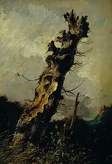 With the timber above ground growing in short supply the souvenir hunters turned to digging up the platform to get to the tree's roots.[3] The tree was dead by 1835.[8] By 1877 only a few fragments of the trunk remained, but were said to be soon to disappear as they were being gathered as souvenirs.[12] By 1881 the site of the tree lay 0.25 miles (0.40 km) from the edge of the Torwood, which had been subject to tree felling and land clearance.[13]