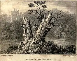 The tree is known as the "Wallace Oak", "Wallace's Tree" and "Wallace's Oak" for its association with 13th & 14th-century Scottish independence leader William Wallace.[3] Wallace is said to have retreated to the Torwood after a defeat in the north of the country and hidden within its hollow trunk.[3] The tree is then said to have become the headquarters of Wallace, who used the nearby wood to hide his troops, for a number of years.[2][4] Wallace is said to have slept within the trunk of the tree which was large enough to accommodate him and several of his officers and addressed his men when they assembled beneath its canopy.[5][6][2] The tree at this point is reputed to have been of great size, being described as the largest tree ever to have grown in Scotland and able to provide shade for a thousand men.[4][3][1]