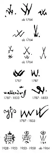 Until 1833 the company remained in the hands of Hammann’s family. The turbulent years after that were characterised by often changing ownership. Among famous names—indications of porcelain tradition and quality even today—can be found Hutschenreuther, Kämpfe, Sonntag, Heubach, Fraureuth, and Schaubach. The changes in ownership and the economic up and downs were reflected in changes intrademarks. In this time imitations of the Meissen porcelain trademark were noticed and were the subject of complaints to the Electoral Saxe-Coburg Land Authority. Today’s trademark of the letter W below a crown and the foundation year of 1764 was introduced 200 years after the foundation of Wallendorf porcelain.